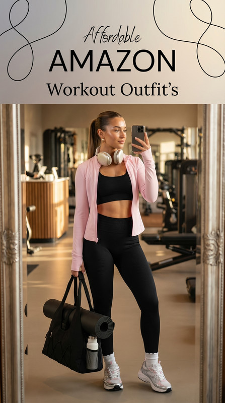 Black ribbed matching set with a soft pink zip jacket. Clean, classic, and budget-friendly. Complete with gym bag and yoga mat for the full look.