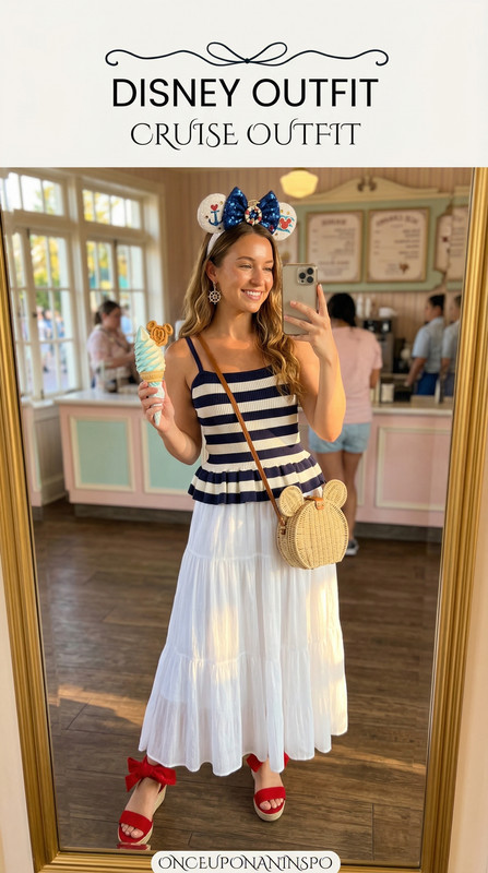 This nautical-inspired ensemble combines classic maritime stripes with magical Disney touches. The comfortable yet chic design keeps you cool during tropical port adventures while looking picture-perfect for character meet-and-greets. The wicker Mickey purse adds that perfect vacation vibe, and those red bow sandals? Pure Minnie magic! Whether you're exploring Castaway Cay or dining at Animator's Palate, this outfit delivers both style and comfort for your magical voyage.