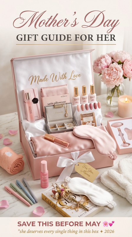 Curated self-care essentials including satin pillowcase, sleep mask, nail polishes, jewelry box, and beauty treats. Everything she deserves in one beautiful box.